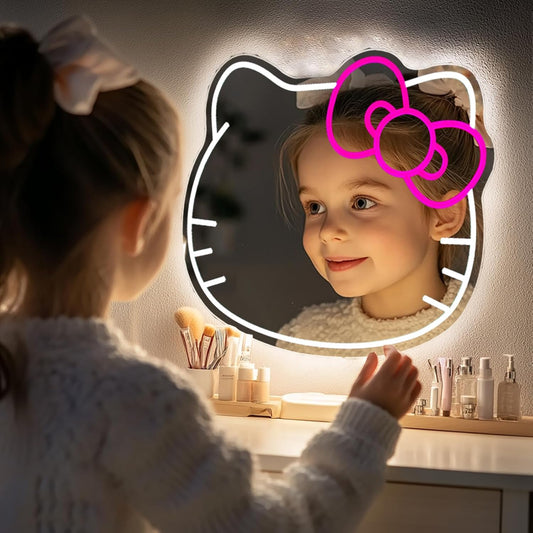 Mllum Anime Hello Kit Mirror Vanity Neon Sign, Cute Cat with Lights Stuff Room Decor, Dimmable Makeup Mirror for Teen Girl Gift Bedroom Room Decor 15.53 x 13.19 inch